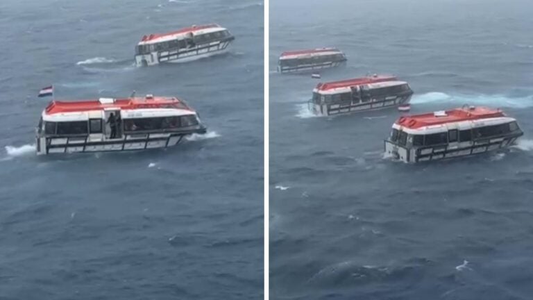 Video of the incident shows the small tender boats bobbing aggressively in the wind and rain, with the cloth over the boats’ entrances whipping about with the gusts. At times, the boats’ bows are splashing in and out of the aggressive swells.